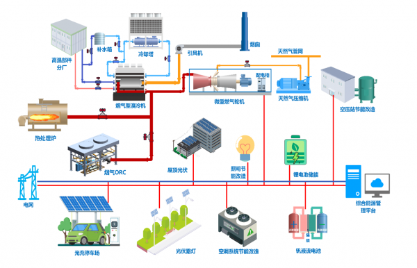 同時,該綜合能源系統(tǒng)著力進行現(xiàn)有用能系統(tǒng)的節(jié)能改造,先后完成了廠房照明、路燈LED替換節(jié)能改造,空壓站壓縮機降耗改造,空氣源熱泵節(jié)能改造,生產(chǎn)系統(tǒng)電機節(jié)能更新改造以及循環(huán)水系統(tǒng)節(jié)能改造。