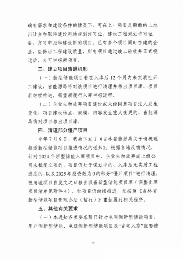 針對2024年新型儲(chǔ)能入庫項(xiàng)目中,企業(yè)主動(dòng)放棄或上級公司未批復(fù)立項(xiàng)的、項(xiàng)目仍處于謀劃中的、入庫后無實(shí)質(zhì)工程進(jìn)度的,以及2025年投資數(shù)為0的部分“僵尸項(xiàng)目”進(jìn)行清理被清理項(xiàng)目自發(fā)文之日移出我省新型儲(chǔ)能項(xiàng)目庫。