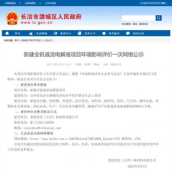 新建全釩液流電解液項目環境影響評價一次網絡公示