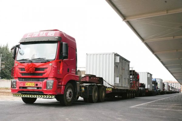 同一時刻,另一場“能源接力”也正在上演。河北科力遠保定工廠啟動了200MWh儲能系統產品交付工作。隨著指令下達,起重機將大型儲能柜吊裝至重型卡車上。中午13點18分,在河北科力遠總經理賈文杰及公司員工的共同注視下,一輛輛滿載儲能柜的卡車組成“能源長龍”,正式奔赴山東臨沂的羅莊獨立儲能電站項目。