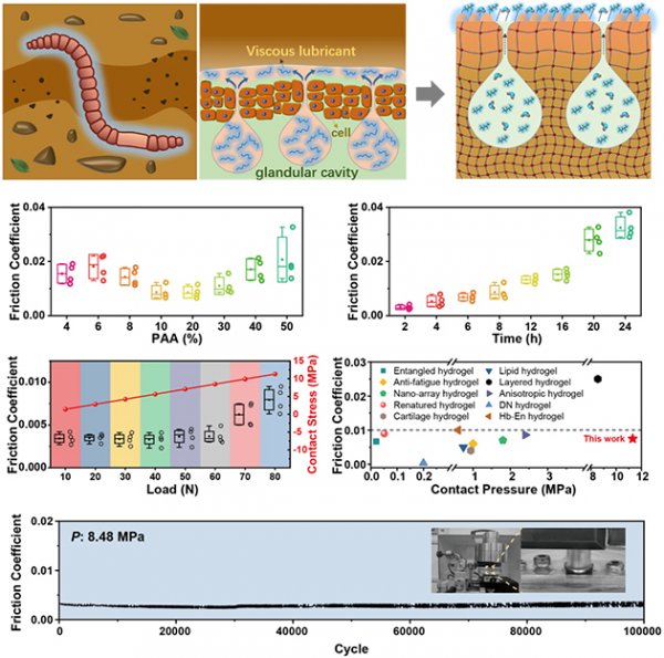 中國科學院蘭州化學物理研究所潤滑材料全國重點實驗室研究員周峰和麻拴紅團隊受自然界蚯蚓持續潤滑機制啟發,開發了一種基于微量潤滑劑的聚合物凝膠超潤滑材料。