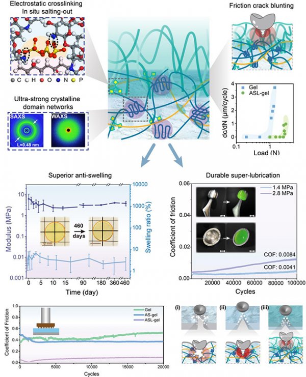 在解決聚合物凝膠材料超高承載和機械魯棒性超潤滑難點基礎之上,研究人員將關注點轉移到解決材料在苛刻鹽離子介質中的長效力學穩定性難題。盡管已報道的大多數聚合物凝膠材料能夠實現優異的承載與減摩功能,但其在復雜離子介質中普遍存在溶脹和力學失效問題,摩擦學評價往往以去離子水為潤滑介質,這明顯與聚合物材料的實際應用工況不符(海水或生理介質),使得相關材料的開發僅僅停留在概念和模型水平。