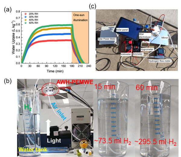 (a)吸附劑在不同相對濕度下的空氣集水性能;(b)室內模擬太陽光驅動實驗;(c)野外觀測實驗 |