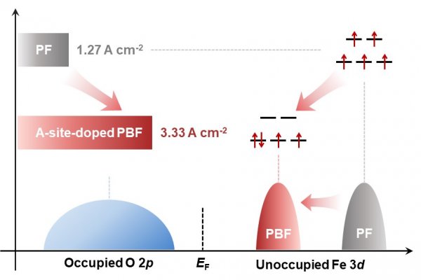 SOEC具有電流密度高、法拉第效率高、過電勢低等優勢,被認為是實現二氧化碳(CO2)減排和能源高效轉換的關鍵技術之一,鈣鈦礦氧化物是常見的SOEC陽極材料。大量研究表明,在堿性電解水OER過程中,鈣鈦礦的電催化OER性能與eg軌道電子數呈火山型關系,在eg電子數接近1時活性最高。然而,目前對高溫OER催化劑電子結構的精確調控機制尚不明確,尤其是eg電子占據數與高溫OER活性的內在關聯尚不清晰。